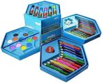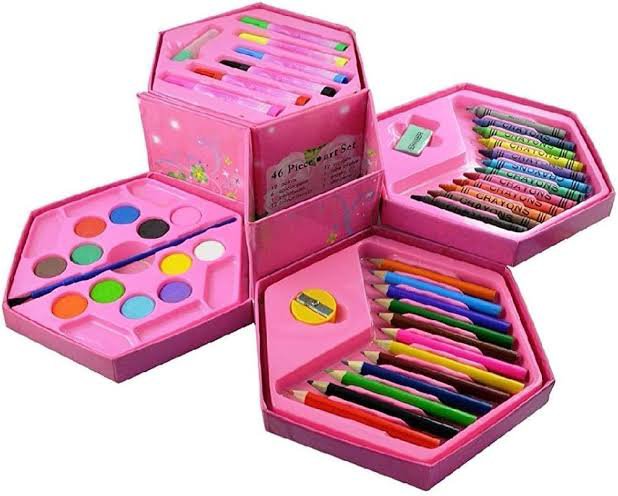 Complete 46-Piece Set β Includes color pencils, crayons, sketch pens, watercolor cakes, oil pastels, and essential stationery tools.