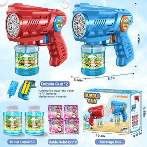 Each set typically includes the bubble gun, bubble liquid, and a tray for easy dipping and play.